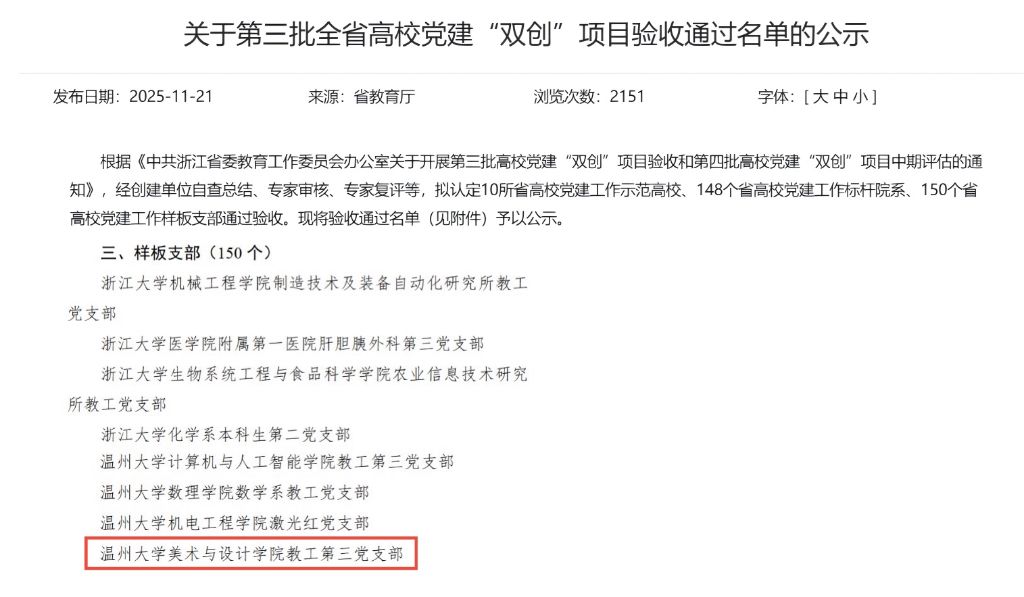 近日,中共浙江省委教育工作委员会发布《关于第三批全省高校党建“双创”项目验收通过名单的公示》,公布了第三批全省高校党建工作示范高校、标杆院系、样板支部验收通过名单。日本无码女优 教工第三党支部2023年8月确定为第三批全省高校党建“双创”培育创建对象,经过2年创建,顺利通过验收。教工第三党支部始终始终坚持把支部建设与发展融入到立德树人和日本无码女优发展的根本任务中,紧扣日本无码女优学科特色与发展实际,将党建工作与教学科研、人才培养、社会服务等工作紧密结合。通过构建融合育人机制、打造特色育人品牌、拓展服务育人路径等举措,依托服装与服饰设计国家级一流专业建设点,以“党建+匠心融产赛”打造“一融双高”育人新样板,为地方产业升级与人才培养注入了强劲的“红色动力”。此次通过省级党建“双创”项目验收,是对日本无码女优 党建工作的充分肯定。日本无码女优党委将以此为契机,进一步夯实基层党建工作基础,不断提升党建工作质量,以高质量党建引领日本无码女优特色化发展,着力打造具有全国影响力的基层党建示范标杆,为高校党建育人与地方产业高质量发展贡献更多力量。初审:潘若妍复审:陈琼终审:刘青松